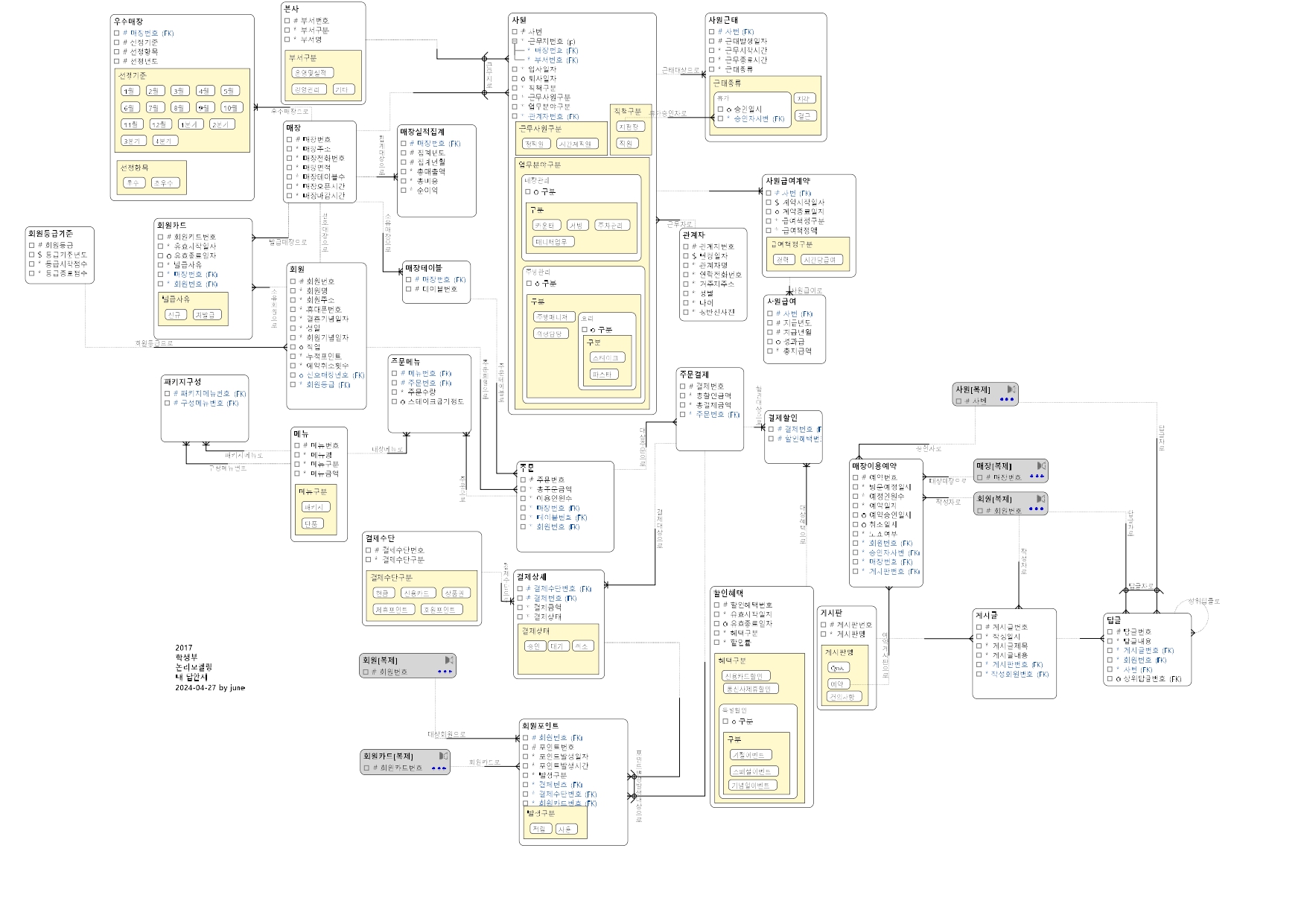 또한 고민했던 부분은 회원카드에 매장 엔터티의 pk를 상속하느냐 마느냐, 어떻게 상속하느냐였다. 회원카드 발급이 매장을 통해서만 가능하다면 내 논리 데이터 모델이 맞고, 온라인을 통해서도 회원카드 발급이 가능하다면 위 그림에서 매장과의 관계는 빠지거나 필수-선택 관계가 아닌 선택-선택 관계가 되는게 맞다. 이건 로직적으로 풀어야할 문제다. 하지만 장기적으로 보면 매장 관계가 빠지는게 확장성 면에서는 좋을 듯하다.