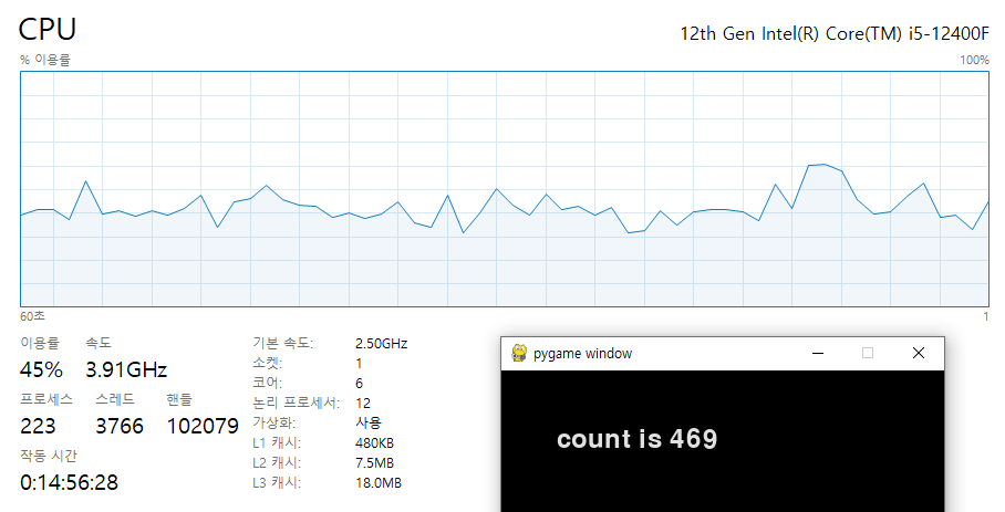 다음으로 FPS를 별도로 설정하지 않은 체로 아래와 같은 코드를 실행했을 때 CPU 지표 그래프다.